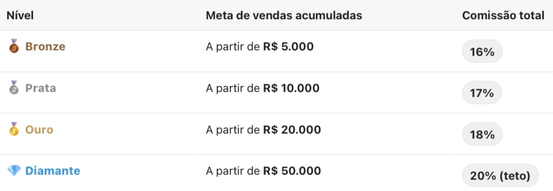 Observações: a comissão é calculada sobre o valor com desconto aplicado (cupom de 10%). Progressão total: 15% até 20% conforme metas atingidas. Pagamentos liberados após a terceira venda concluida ou ao atingir R$: 3.000,00 em vendas acumuladas; repasse semanal via pix.