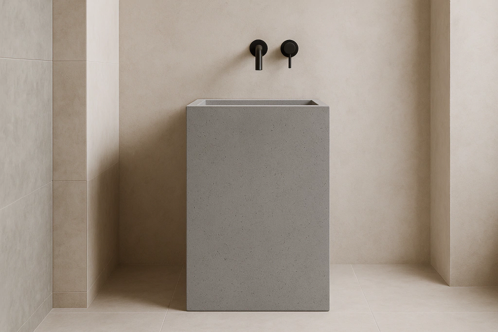 A Cuba de piso em concreto artesanal ZH1000 traz design contemporâneo e funcionalidade para banheiros e lavabos.