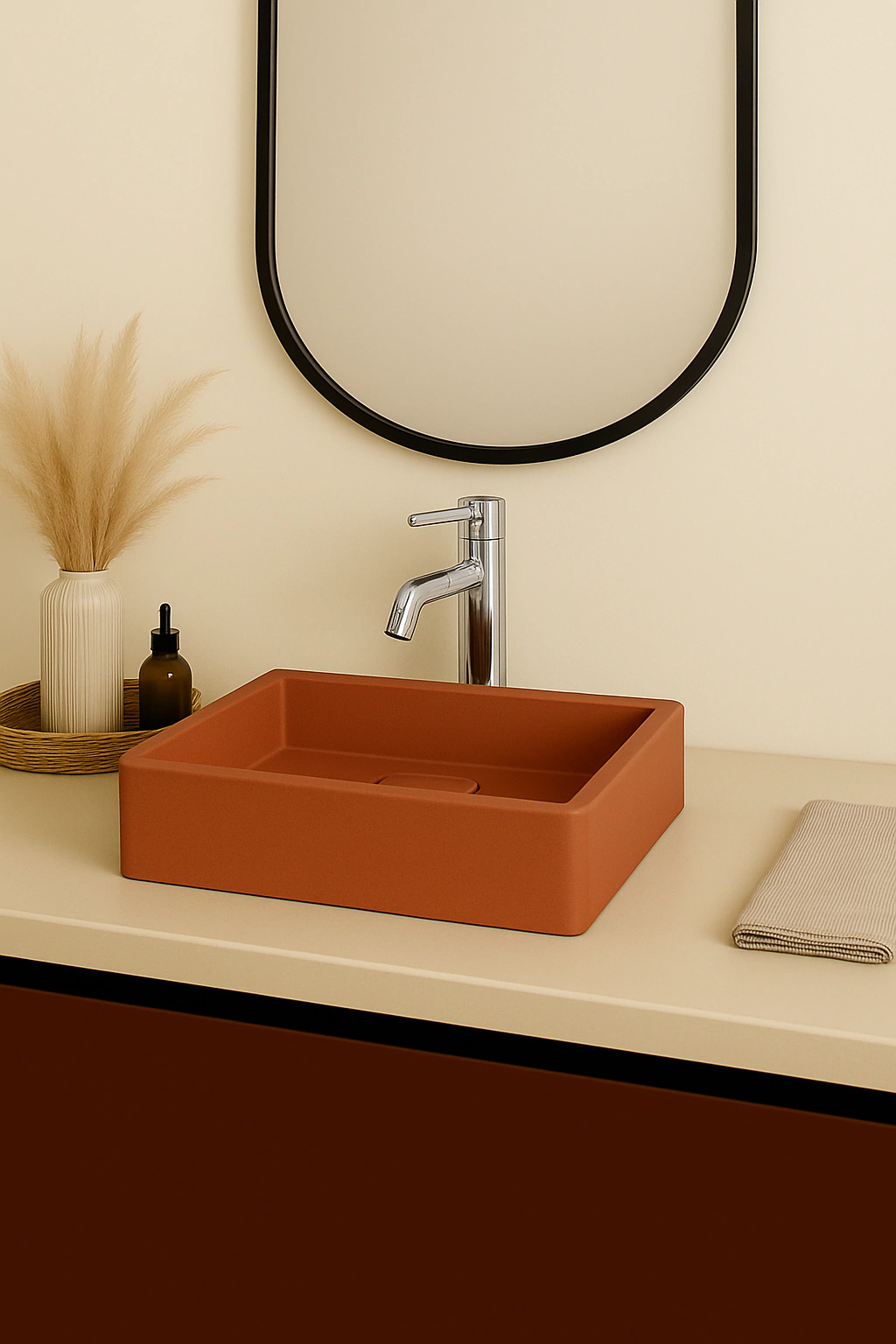 Com dimensões ideais — 10 cm de altura, 39 cm de comprimento e 26 cm de largura —, esta cuba de apoio em formato quadrado destaca-se pelo acabamento liso acetinado que confere um toque natural e refinado. A válvula oculta de 40 mm mantém o visual limpo e sofisticado, perfeita para quem valoriza o equilíbrio entre estética e praticidade.