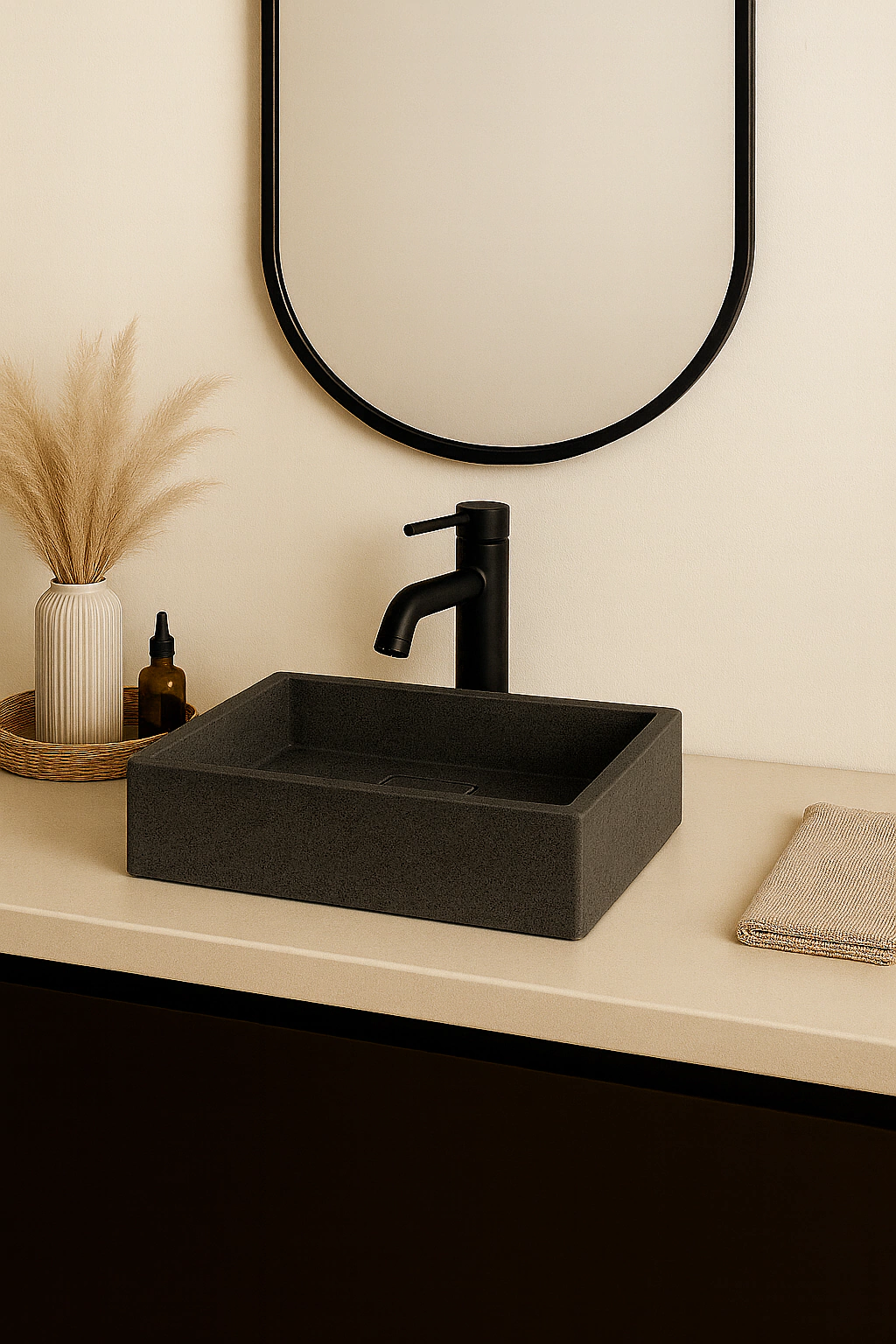 Complementando o conjunto, a torneira de metal com acabamento em preto fosco oferece um design slim e alto (22 cm), ideal para banheiros que buscam um toque contemporâneo sem abrir mão da funcionalidade. Seu estilo minimalista harmoniza perfeitamente com a cuba, elevando a decoração do ambiente.